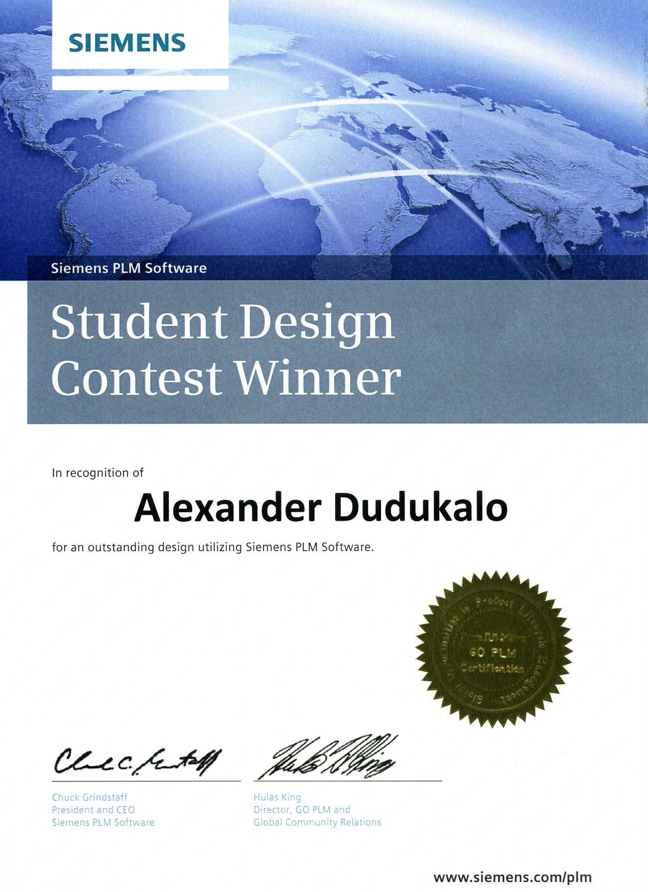 Мы писали о победе А. Дудукало в студенческом конкурсе Go PLM, проводимым компанией Siemens PLM Software.